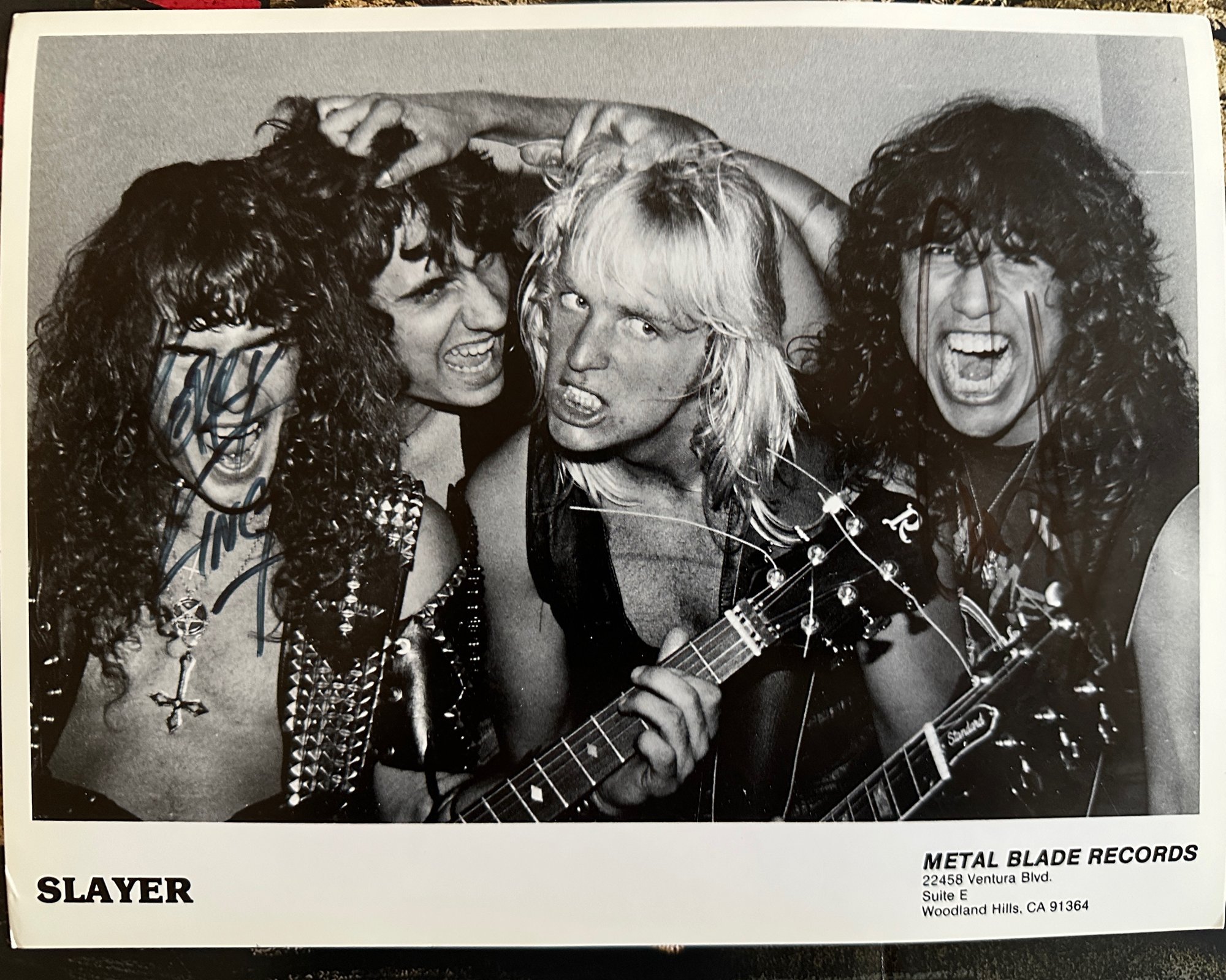 An early promo photo of the band from the Metal Blade Records years, signed by Tom and Kerry. Perfect for your family portrait wall! 1983 - D: 8.5"x11"